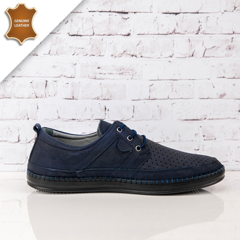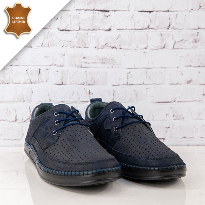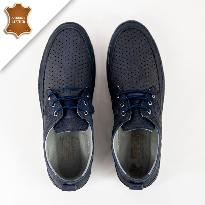 Представяме Ви, шити пролетни-летни мъжки ежедневни обувки с връзки. Те са изработени от висококачествен естествен набук с декоративна перфорация в тъмно син цвят. Връзките улесняват обуването и събуването . Стелката е мека и комфортна от естествена кожа. Опция преглед и тест преди плащане.Произход-Турция.